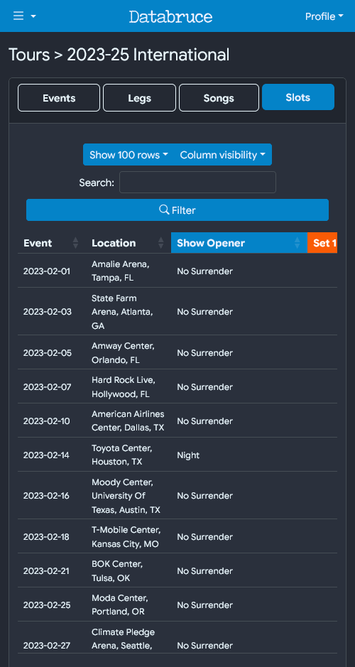 Adding to the previous section, Setlist Slot tables now “fix” the Date/Location columns, and the positions scroll horizontally.
